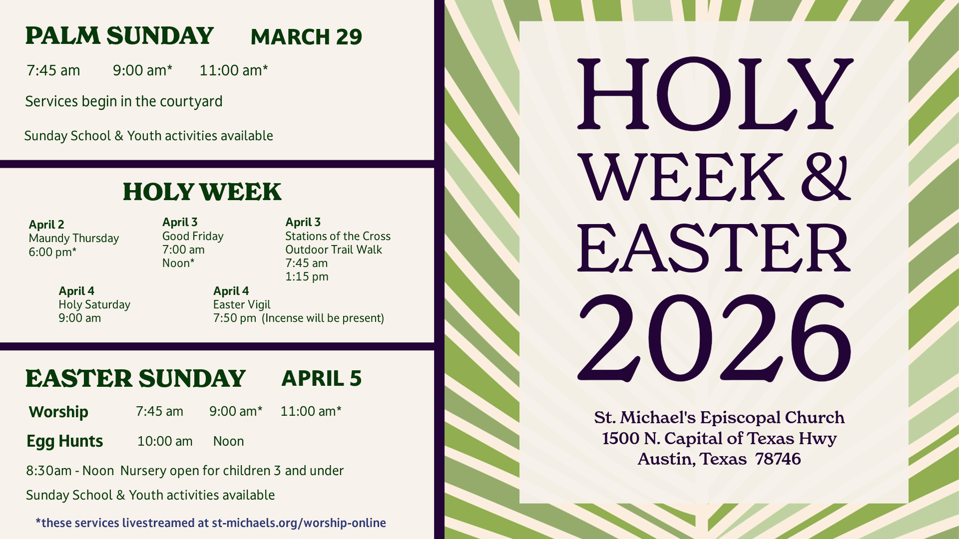 We want you to know the grace of God in Jesus Christ by the quality of our ministry, teaching, and presence. At St. Michael’s, we want to grow our community, to grow in spiritual depth as disciples of Jesus, and to grow in our understanding of how to make a love-spreading difference in the Austin community and beyond. Click here so we can get to know more about you.